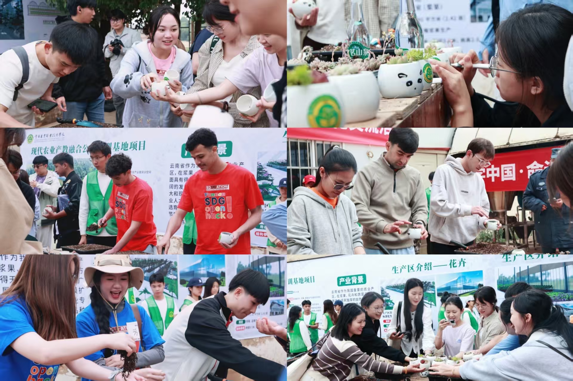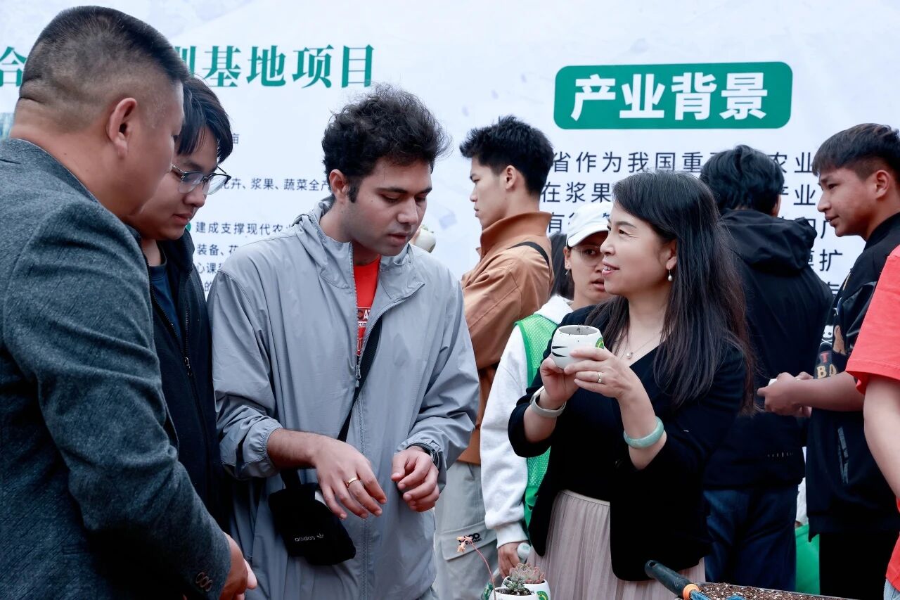 在学校现代农业实训区,来访师生实地观摩特色农业实训成果,参与多肉栽培体验,在动手实践中感受园艺技能与劳动教育魅力,为SDG创新创业挑战赛注入农业产业创新灵感。现场交流氛围热烈,中外青年围绕专业学习、技能实践、文化习俗等话题深入互动,展现出开放包容、互学互鉴的青春风采。